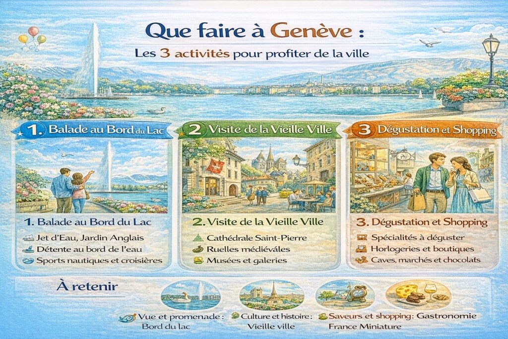 Une journée à Genève, c’est la course douce à travers paysages et rencontres. Jet d’eau, vieille ville, montée à la cathédrale, croiser un local au marché, bateau sur le Léman, bains des Pâquis au bout du carnet de route. Parfois la météo déraille, plat improbable au déjeuner. Découverte rime ici avec instant carte postale et improvisation.